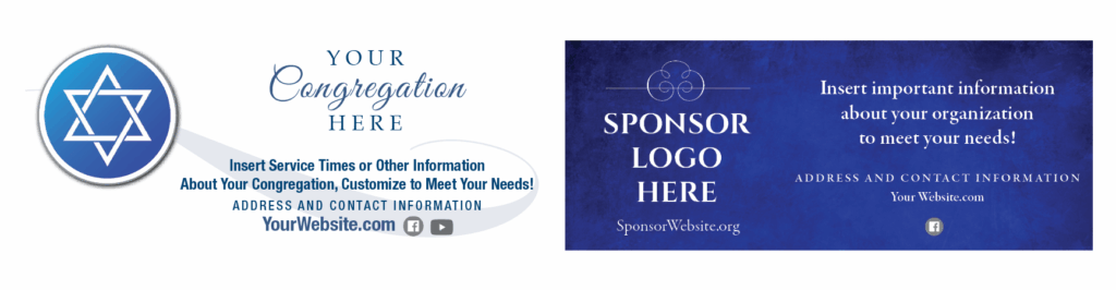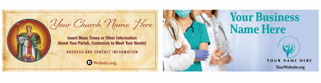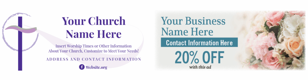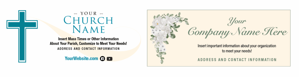 Imprints advertise your organization year-round. Be sure to highlight contact information, clergy names, business hours, and other important information. The best imprints are simple, with clear and concise text and a logo or photo. Be bold — add color!